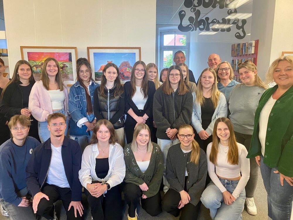 Christiane Borchert, Schulleiterin der Fachakademie, und Frau Gutmann, als Vertreterin der Bücherei, bedankten sich bei allen Beteiligten und Verantwortlichen und eröffneten die Ausstellung bei Fingerfood und einem Glas Sekt.