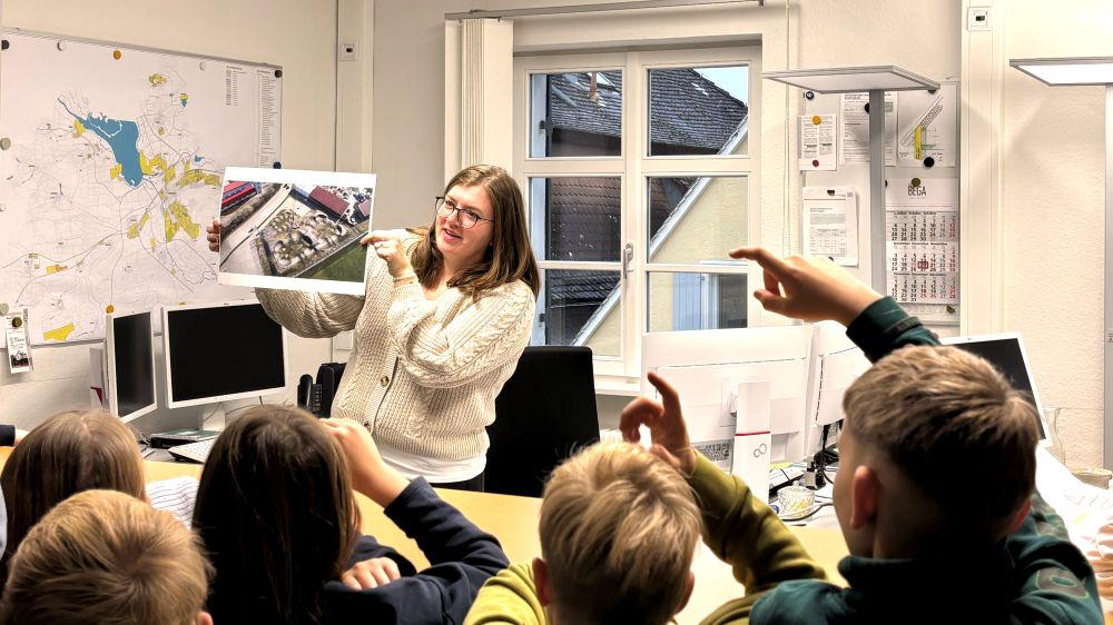Bildunterschrift: Rathausmitarbeiterin Carina Rupp sprach mit den Kindern über die Aufgaben des Stadtbauamts. Foto: Stadt Gunzenhausen/Manuel Grosser