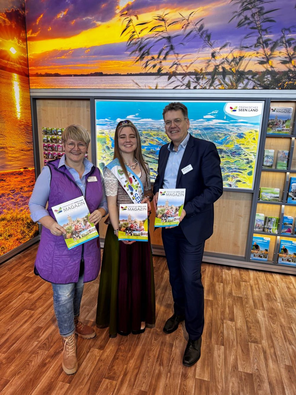 Das königliche Lächeln strahlte gleich doppelt bei der Präsentation des Urlaubsmagazins: Ein Interview mit Leoni Dengler als oberster Markenbotschafterin gehört zum Inhalt. Live am Stand und auf Seite acht war und ist sie mit ihrer original fränkischen Tracht und der Krone ein Blickfang. Das hochwertige Produkt hat inhaltlich aber noch einiges mehr zu bieten, wie Hans-Dieter Niederprüm betonte: „Auf über 70 Seiten zeigen wir das Fränkische Seenland in allen seinen Facetten, von den Seen bis zum Land, von Freizeitspaß bis zu Kulturerlebnissen und von besonderen Unterkünften bis zu kulinarischen Genüssen. Auch viele unserer Partner nutzen diese hochwertige Plattform, um sich und ihre Angebote zu präsentieren.“