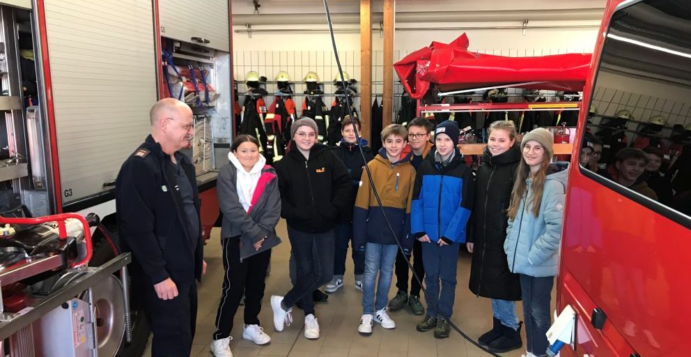 Die Schülerinnen und Schüler wurden vom Team um Kommandanten Joachim Seltmann empfangen und durch die Hallen der FFW geführt. Dort konnten sie die Fahrzeuge der Feuerwehr in Augenschein nehmen und mehr über die wichtigen Aufgaben der Feuerwehr erfahren. Alles, von den Gebäuden über die Fahrzeuge bis hin zu den Geräten, war sehr gepflegt und top gewartet.