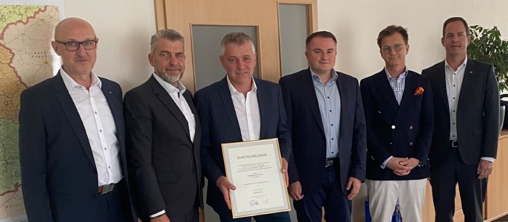 Für seine Verdienste wurde Friedrich Siemandel nun mit der Goldenen Ehrennadel des Genossenschaftsverbands Bayern geehrt – der höchsten Auszeichnung des Verbands. Im Namen der Geschäftsführung dankten ihm stellvertretend vor Ort anwesende Führungskräfte des genossenschaftlichen Verbunds herzlich für seinen unermüdlichen Einsatz und wünschen ihn für sein künftiges Wirken bei der RWH Franken GmbH alles erdenklich Gute.