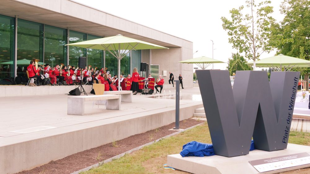Die Fertigstellung des neuen Platzes wurde standesgemäß mit Gästen aus Wirtschaft, Politik, Vereinskultur und heimischer Unternehmerschaft gefeiert. Die schmückende „W“-Skulptur wurde im Rahmen dessen vom Ersten Bürgermeister Karl-Heinz Fitz, der Wirtschaftsjunioren-Vorsitzenden Nicole Vierheller und Stadtmarketing-Vorsitzenden Alexander Herzog an die Öffentlichkeit übergeben. Musikalisch umrahmt wurde die Einweihung durch die Dittenheimer Blaskapelle. Sowohl Wirtschaftsjunioren als auch Stadtmarketingverein hatten übrigens einen doppelten Grund zum Feiern: Die WJ Gunzenhausen feierten 40sten, der Stadtmarketing Gunzenhausen e.V. 10jähriges. Herzlichen Glückwunsch!