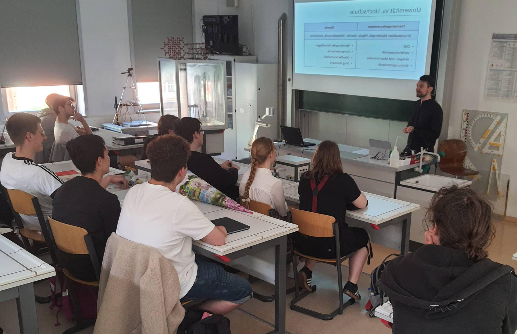 Weißenburg (red). Der Chemiker Maximilian Dill, MSc referierte vor den 12. Klassen der Ausbildungsrichtungen Technik und Gesundheit der FOSBOS Weißenburg über Ablauf und Ausgestaltung eines Chemiestudiums sowie den anschließenden Möglichkeiten einer Promotion und einer Karriere in der Industrie. Dill, der vor etwas mehr als acht Jahren sein Abitur an der Weißenburger FOS gemacht hatte, kehrte damit an seine alte Ausbildungsstätte zurück.